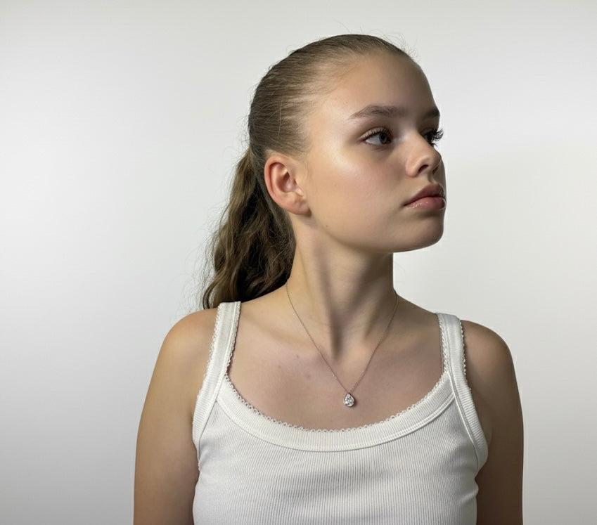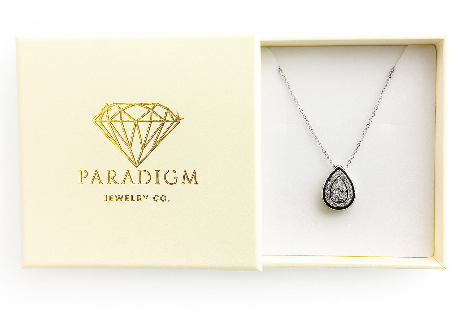 Add a touch of timeless elegance with this 1-carat Moissanite drop pendant necklace, designed to shimmer with refined brilliance. Crafted from 925 sterling silver, it features a hand-cut lab-created Moissanite gemstone with D color grade, VVS1 clarity, and an excellent cut for exceptional sparkle and fire. The elegant 5×8mm pear-shaped stone rests on a delicate collarbone chain, perfect for both everyday sophistication and special occasions. Simple yet luxurious, it’s a classic piece that complements any outfit. Presented in a Paradigm Jewelry Co. gift box — ready to treasure or gift.